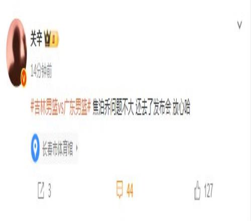 赛后,广东男篮队记关辛报道焦泊乔的伤病问题表示:“焦泊乔问题不大,还去了发布会,放心哈!”