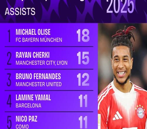 2025年五大联赛助攻榜:奥利塞18次居首,谢尔基15次位列第二