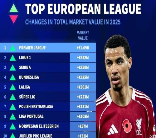 2025年欧洲联赛身价涨跌榜:英超上涨10.9亿欧居首,法甲第二